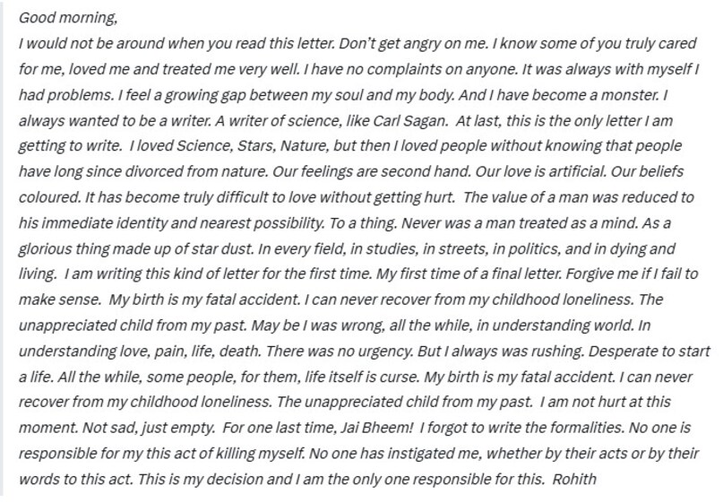 उमा अन्ना, ये काम आपके कमरे में करने के लिए माफी चाहता हूं. अंबेडकर स्टूडेंट्स एसोसिएशन परिवार, आप सब को निराश करने के लिए माफी. आप सबने मुझे बहुत प्यार किया. सबको भविष्य के लिए शुभकामना. आखिरी बार जय भीम….. मैं औपचारिकताएं लिखना भूल गया. ख़ुद को मारने के मेरे इस कृत्य के लिए कोई जिम्मेदार नहीं है. किसी ने मुझे ऐसा करने के लिए भड़काया नहीं, न तो अपने कृत्य से और न ही अपने शब्दों से. ये मेरा फैसला है और मैं इसके लिए जिम्मेदार हूं. मेरे जाने के बाद मेरे दोस्तों और दुश्मनों को परेशान न किया जाए. रोहित.